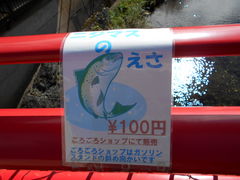 橋の上から、たくさんの魚が観察できます。近くでニジマスの餌を売っていて、投げ入れるとすごい勢いで食らいついてきました。