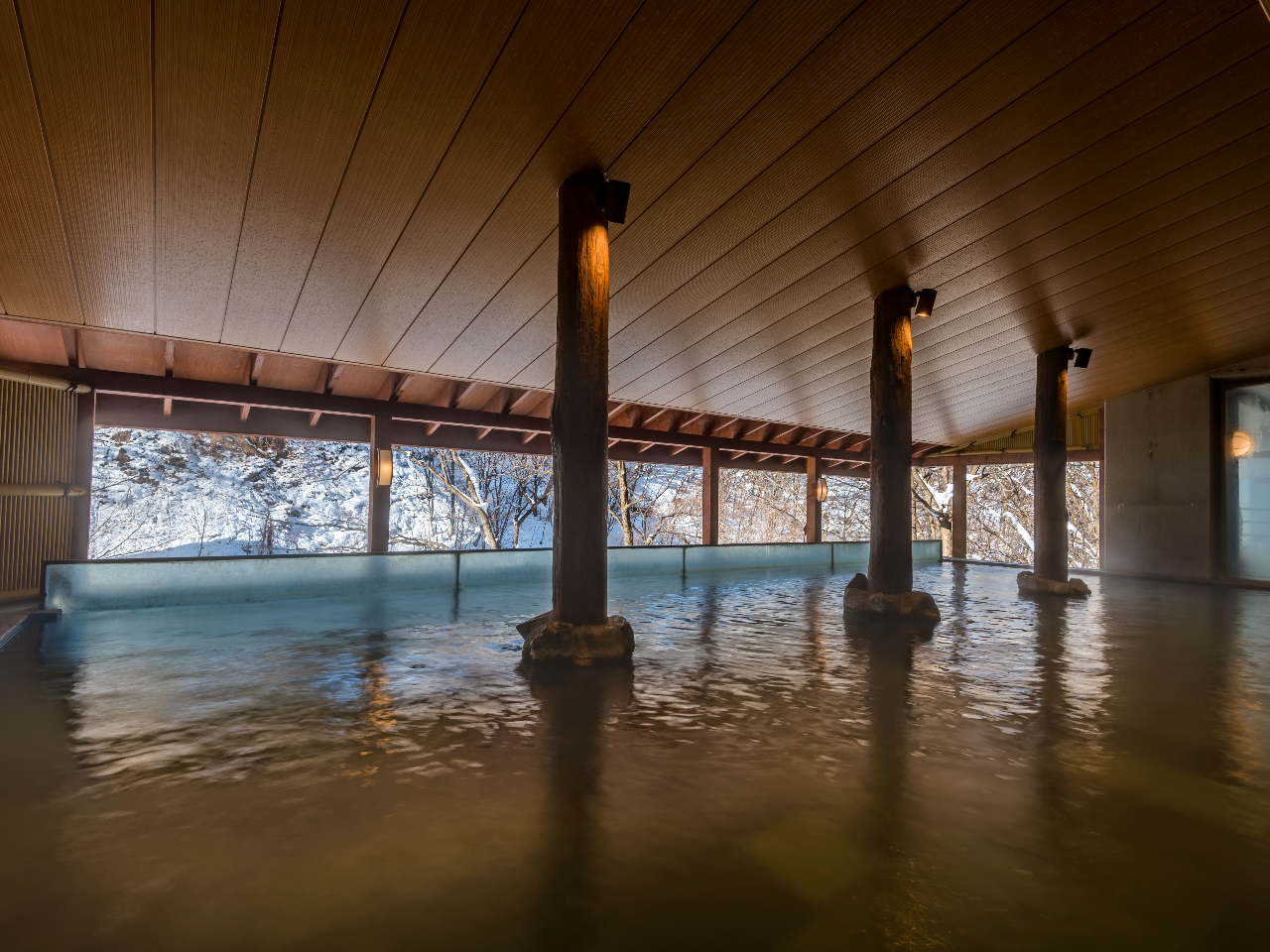 源泉掛け流しの効能豊かな温泉と窓の外に広がる渓流の風景が自慢の浴場。小浴場には、大きめの檜風呂があり、湯は肌にやわらかく檜の香りがやさしく包みこむ。大浴場には棚湯、寝湯を...