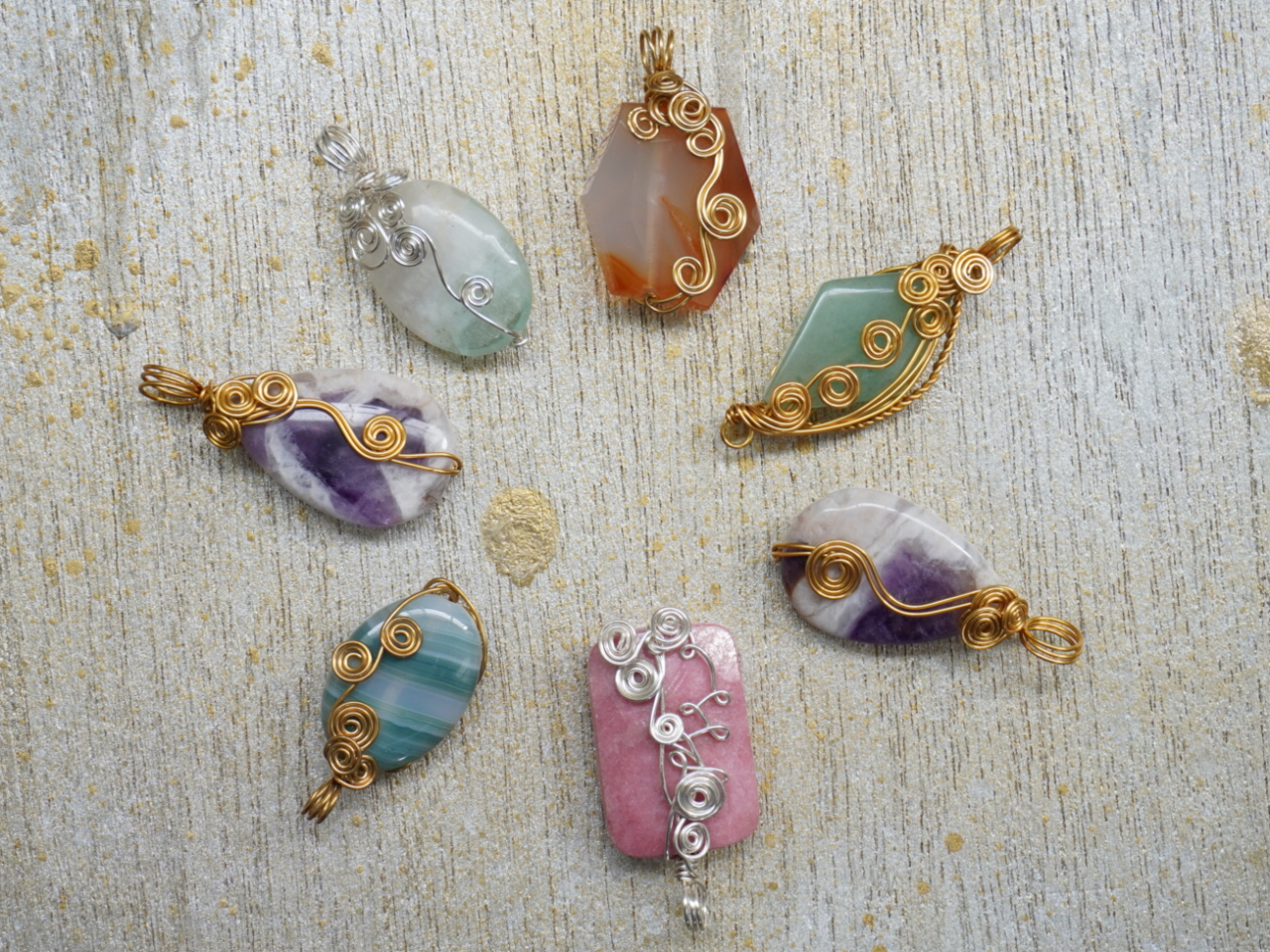 - 初めに天然石から好きな石を選び頂き、アーティスティックワイヤーを使いペンダントトップを作ります♪ ワイヤーを自由に曲げたり、ウズウズにしたりして、オリジナルのペンダントトップに仕上げましょう!