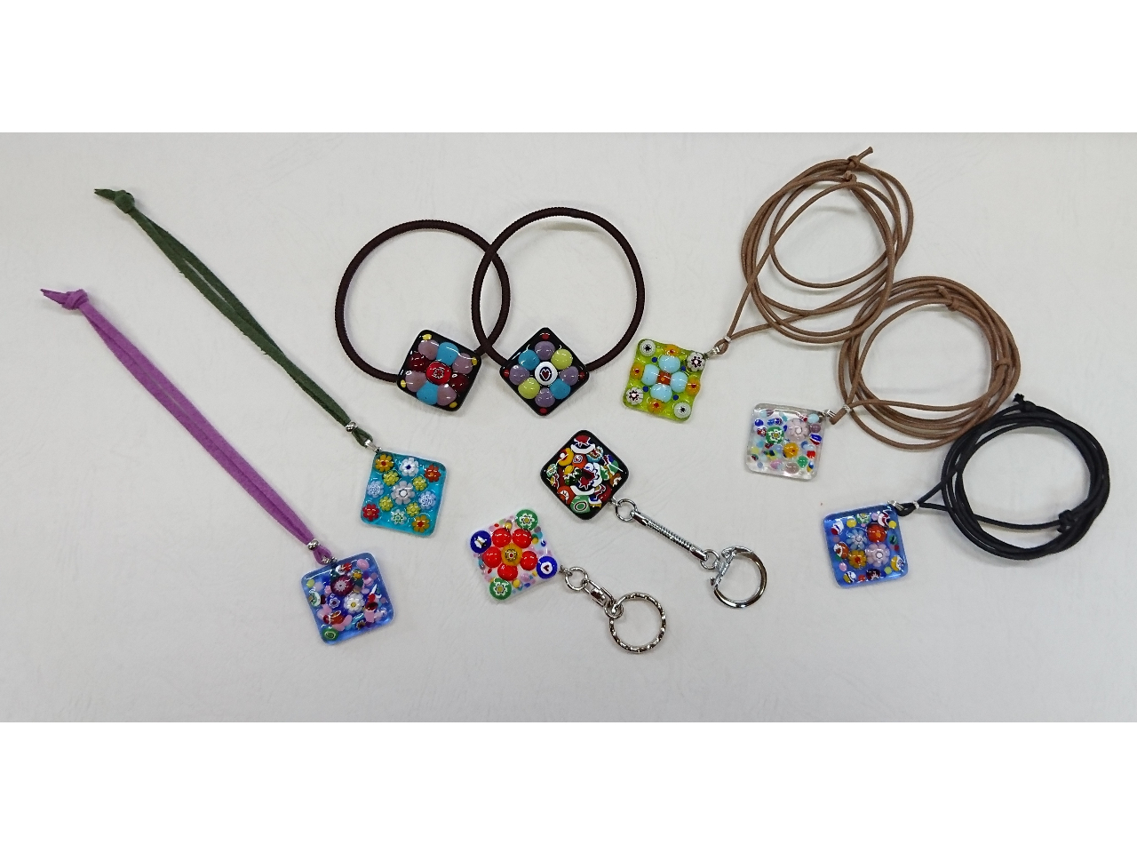 - 作成は簡単、パーツを選んで金具でつなぎアクセサリーに加工。 小さなお子様から友達やカップル、家族の皆さんで楽しく作れます。 ガラスの動物や金箔、銀箔模様のとんぼ玉が大人気。作品は当日お持ち帰りOK