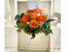 - 布にイラストが印字された温かみのあるデザインのボードを使って プリザーブドフラワーで花束のようにアレンジ。壁掛けにもスタンドで自立させることもできます。