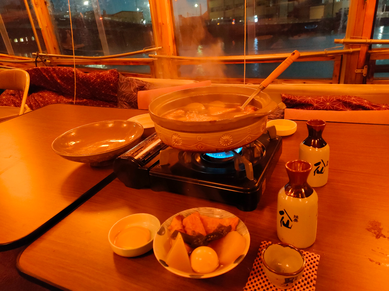 - 〇新春の貸切こたつ屋形船!おでんと熱燗と景色を楽しもう! 〇おでんは7種類、お新香、うどん、おにぎり 〇熱燗は陸奥八仙1合2本の2合付き! ◯工場夜景とうみねこ餌付け体験も楽しめます!