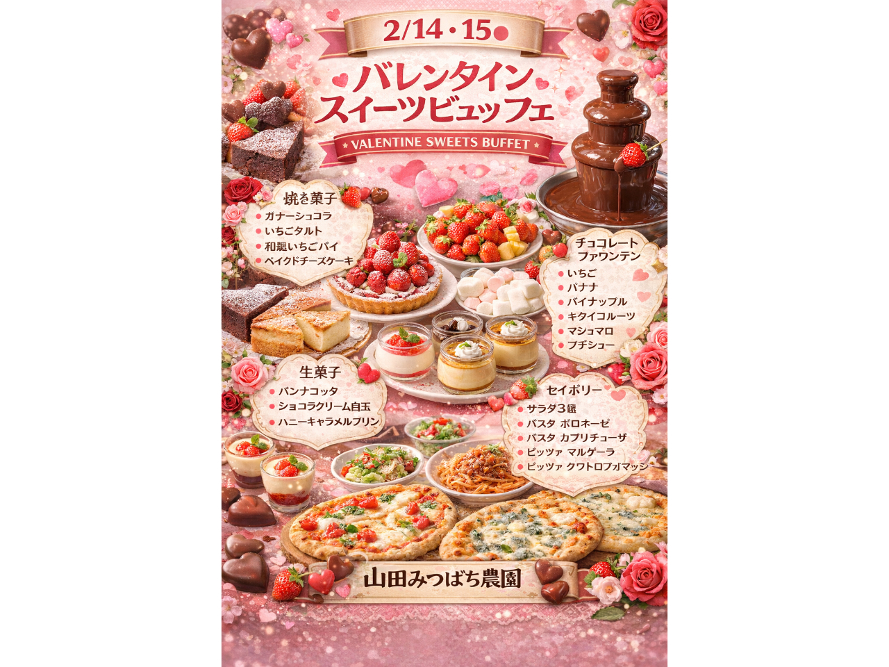 - 山田養蜂場のイタリアンシェフがすべて手作りするスイーツ♪ いちごでバレンタイン★ 鏡野町産野菜のサラダバー・パスタ2種・ピザ2種をご用意!
