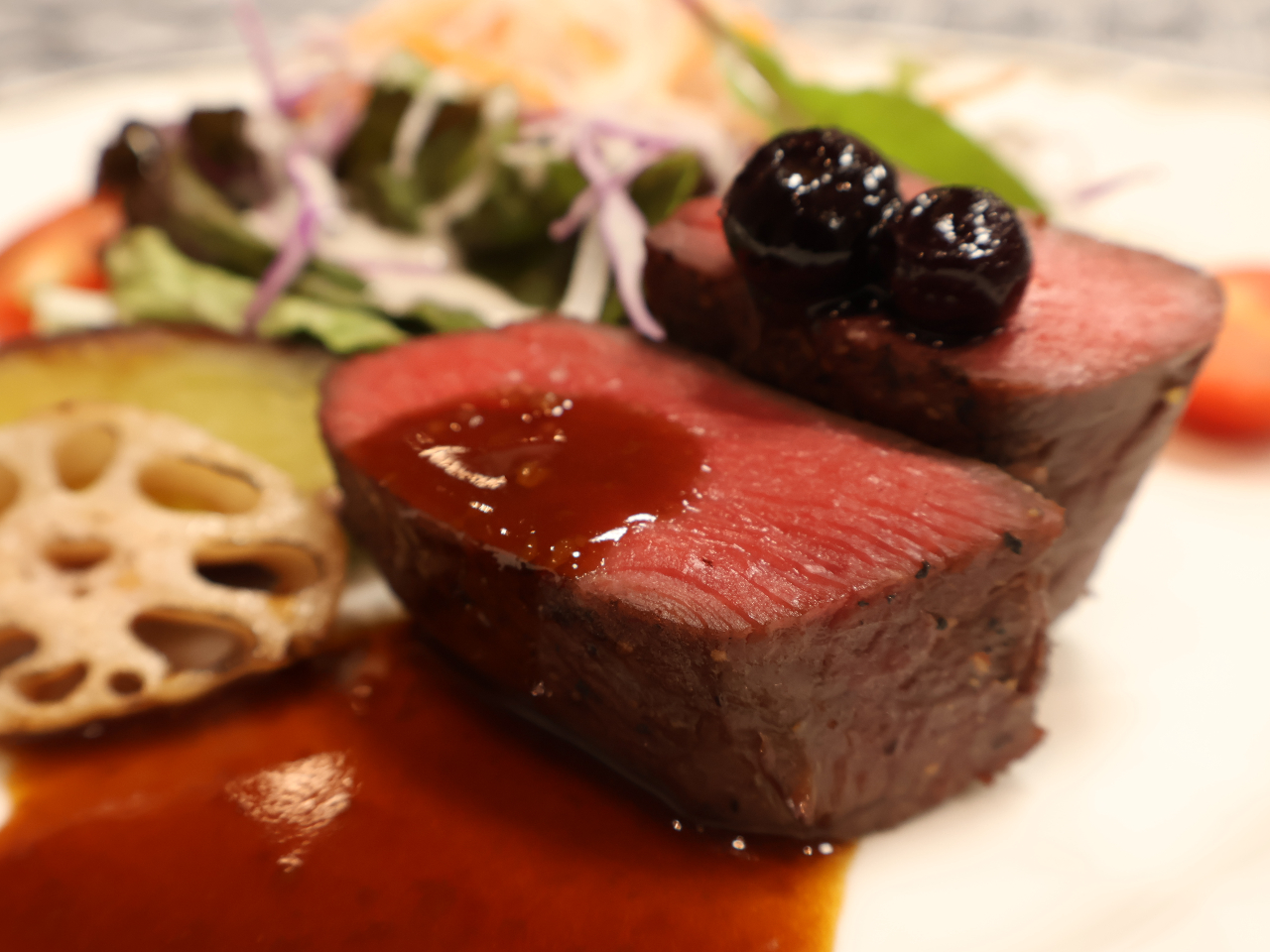 - 狩猟漫画家「アキヤマヒデキ」氏が解体した鹿肉。処理が完璧で臭みがない。その鹿肉をホテルのシェフランチで食べてみよう。普段から鹿肉を食べている猟師たちも驚いたジビエランチ。自然の中でロープワーク体験も。