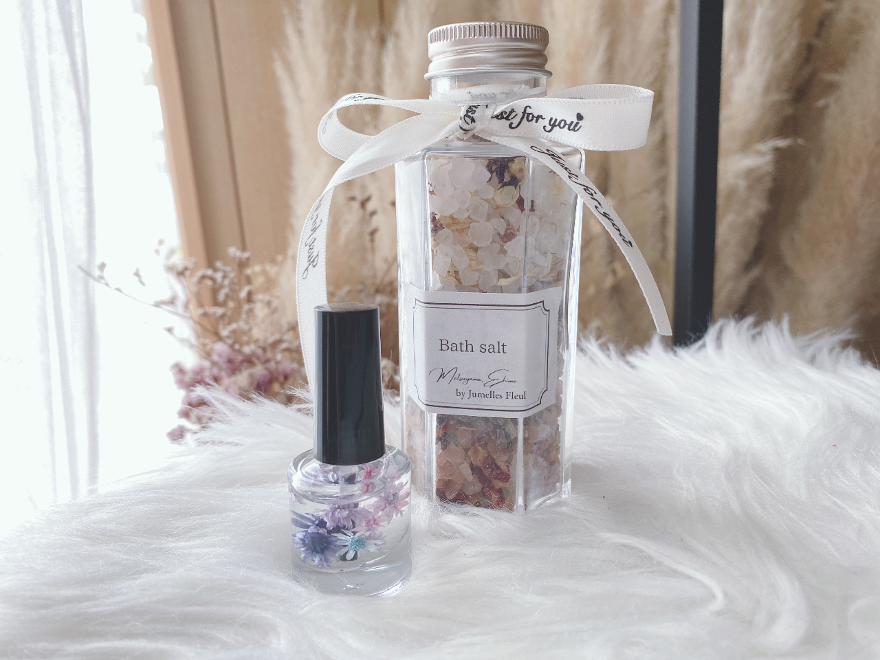 - ヒマラヤ岩塩とお花のハーブを使って、心も体も癒されるハーブバスソルト作りと、可愛いお花を閉じ込めた可愛いフラワーネイルオイル作りのセット体験。