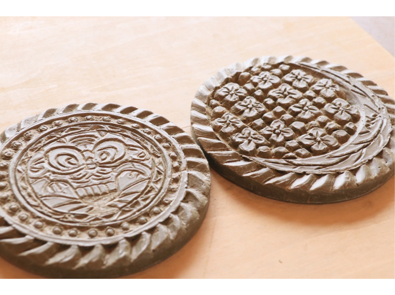 - ●午前の部【23cm角タイル状板瓦粘土】淡路瓦粘土で彫刻体験