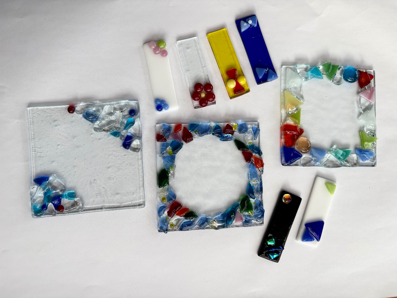 - 色とりどりのガラス片を土台のガラスの上に並べ電気窯で溶かして焼成させるフュージングという技法です。ガラスを並べるだけなので、子供から大人まで楽しめます。思い思いの一品を楽しんで制作してください。
