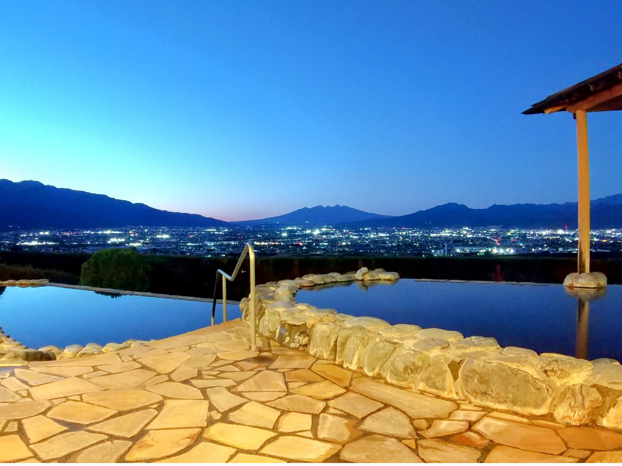 - 露天風呂からは南アルプス、八ヶ岳、秩父山系の眺望や、甲府盆地を 見下ろすことができる絶景温泉です。お昼と夜で違う景色をご覧いただけます。 温泉は男女別日替わりでお楽しみいただけます♪