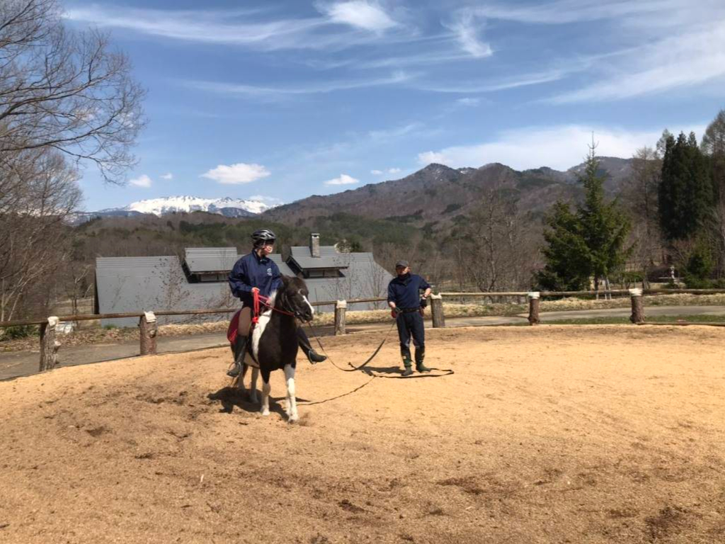- 北アルプスの山々を背景に心地いい風を感じながらプチ乗馬体験♪スタッフが綱を引くポニーに乗るので初めての方でも楽しめます。馬にひとりで座れるお子さまから体重70キロの方まで体験できます。