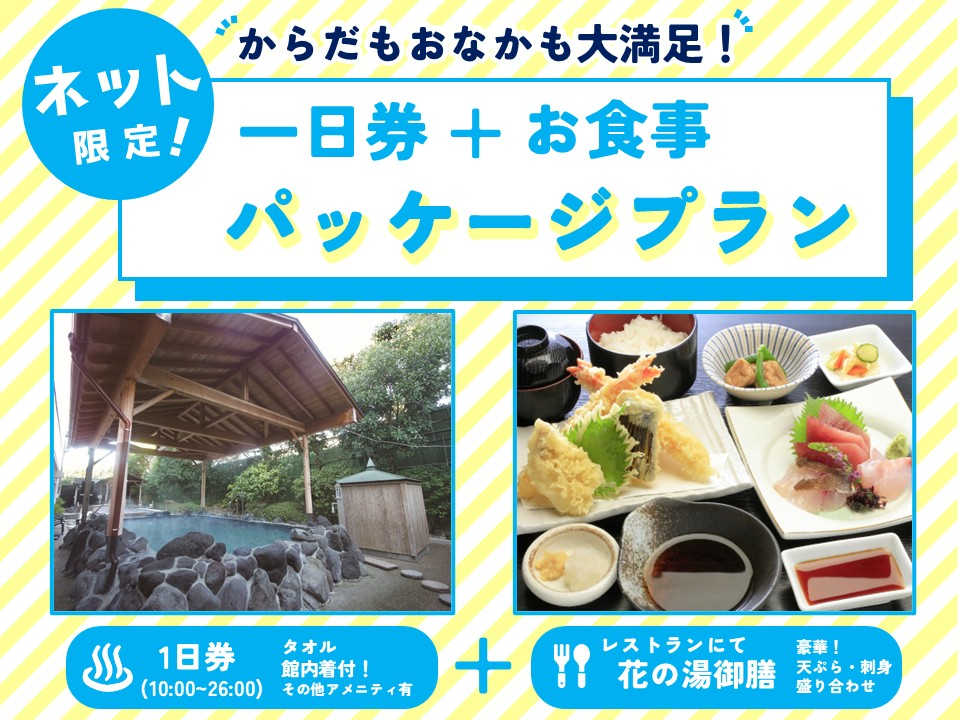- 【食事+日帰り温泉(富士宮市)】豪華!天ぷら・刺身盛り合わせの「花の湯御膳」付き...