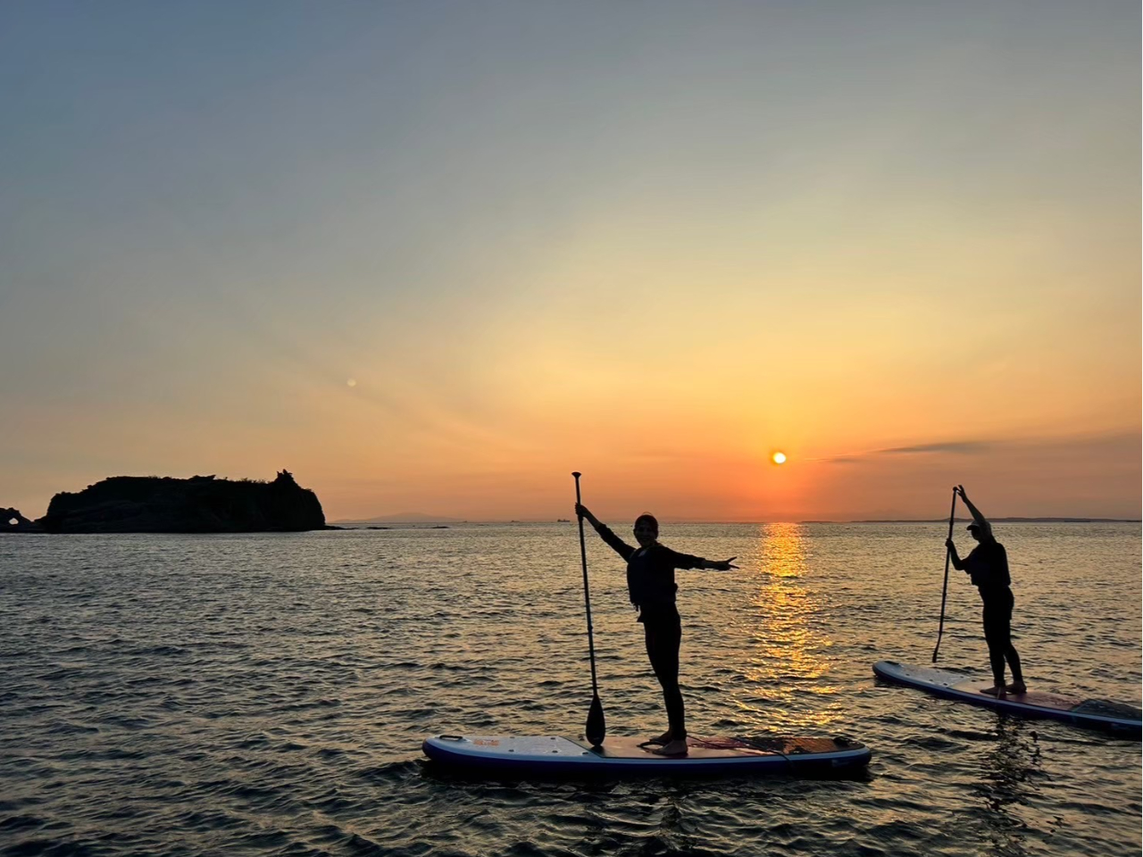 - 鋸南町勝山海岸で出会える、圧倒的な夕日。 東京湾の穏やかな水面に、黄金色の夕日が静かに沈む。 SUPに乗って海の上から眺めるその景色は、まさに「気絶級のサンセット」。