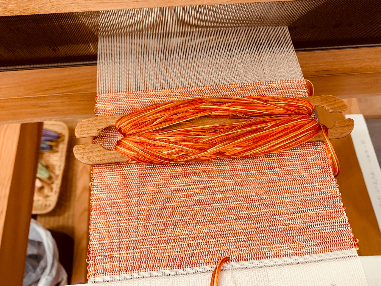 - 繭から日本製の絹糸は日本に流通している絹の0.15%しかありません。そんな氏素性がはっきりした絹糸をバラや桜、あかね、マリーゴールドなどで草木染め。経糸も選んで自分でかけて頂き、一日で織りあがります。