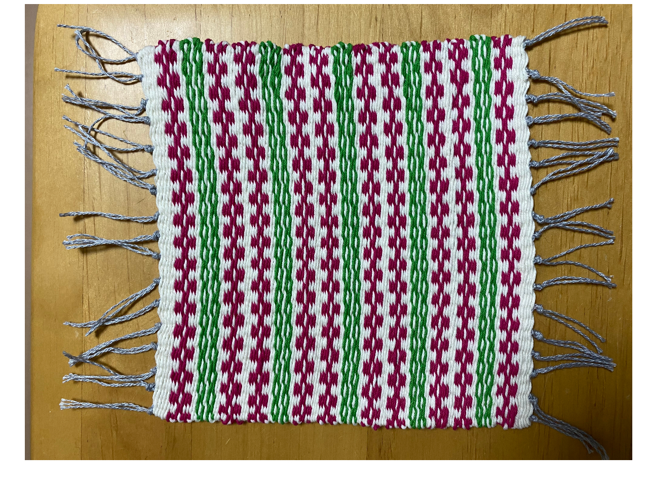 - こんなかわいいデザインの織物が織り未体験の初心者さんでも織れます。しかもデザインを自分で考えることもでき、糸の色を選べば世界で一つだけの織物になります。簡単で楽しい織りをぜひ体験しにいらしてください。