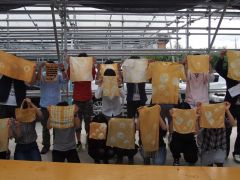 工業用の機械を使ってお好きな布製品の絞り染体験ができます! 染められる製品は、お一人様2点までです。