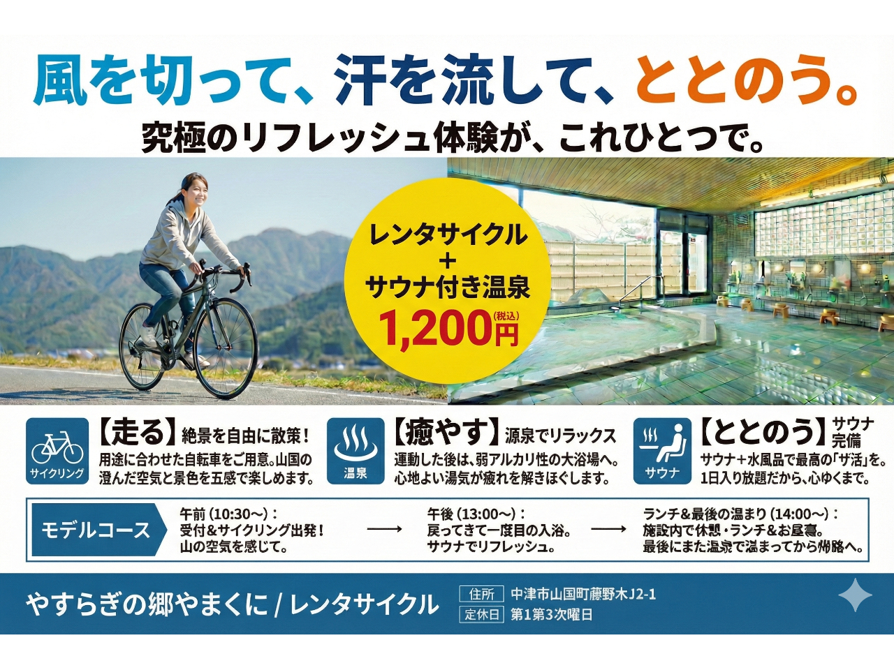 - 「レンタサイクル」と「サウナ付き温泉(1日入り放題)」