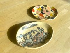 - 素焼きのお皿に、陶芸用の絵の具やクレヨンで自由に絵を描きます。 大皿1枚、または小皿2枚から選択します。 対象年齢は小学4年生以上です。