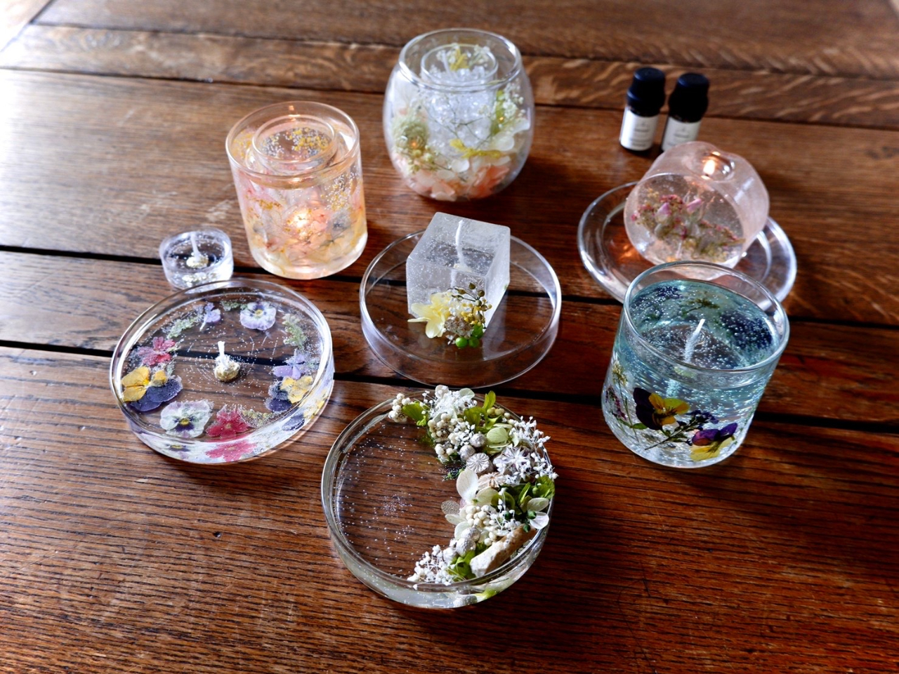 - Lサイズの豪華なジェルキャンドルです。カラーや香りを選ぶのも楽しく、お花はたくさんの花材の中から選べます。お友達とおしゃべりしながら、作るのもたのしいレッスンです。