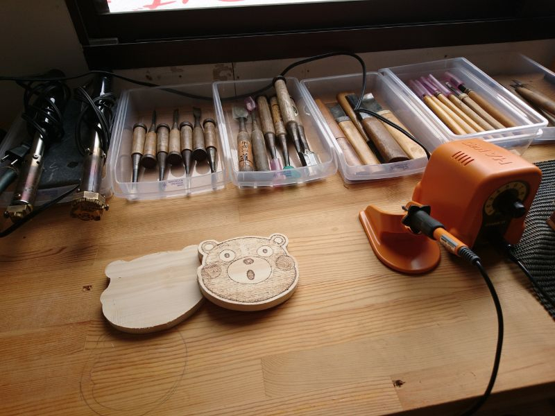 - 電熱ペンを利用して、くまモン型のコースターを作ります。 色々な種類のナイフややすり、電動工具を準備していますので、より自分の思い描く作品を作ることが出来ます。