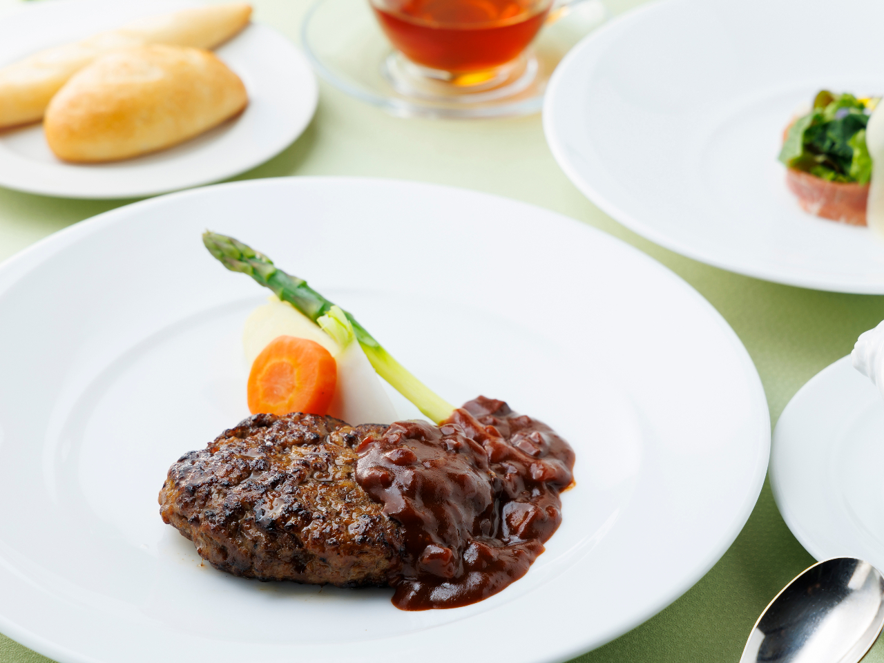 - 肉の旨味を閉じ込めた博多和牛入りハンバーグを心ゆくまでお楽しみください。