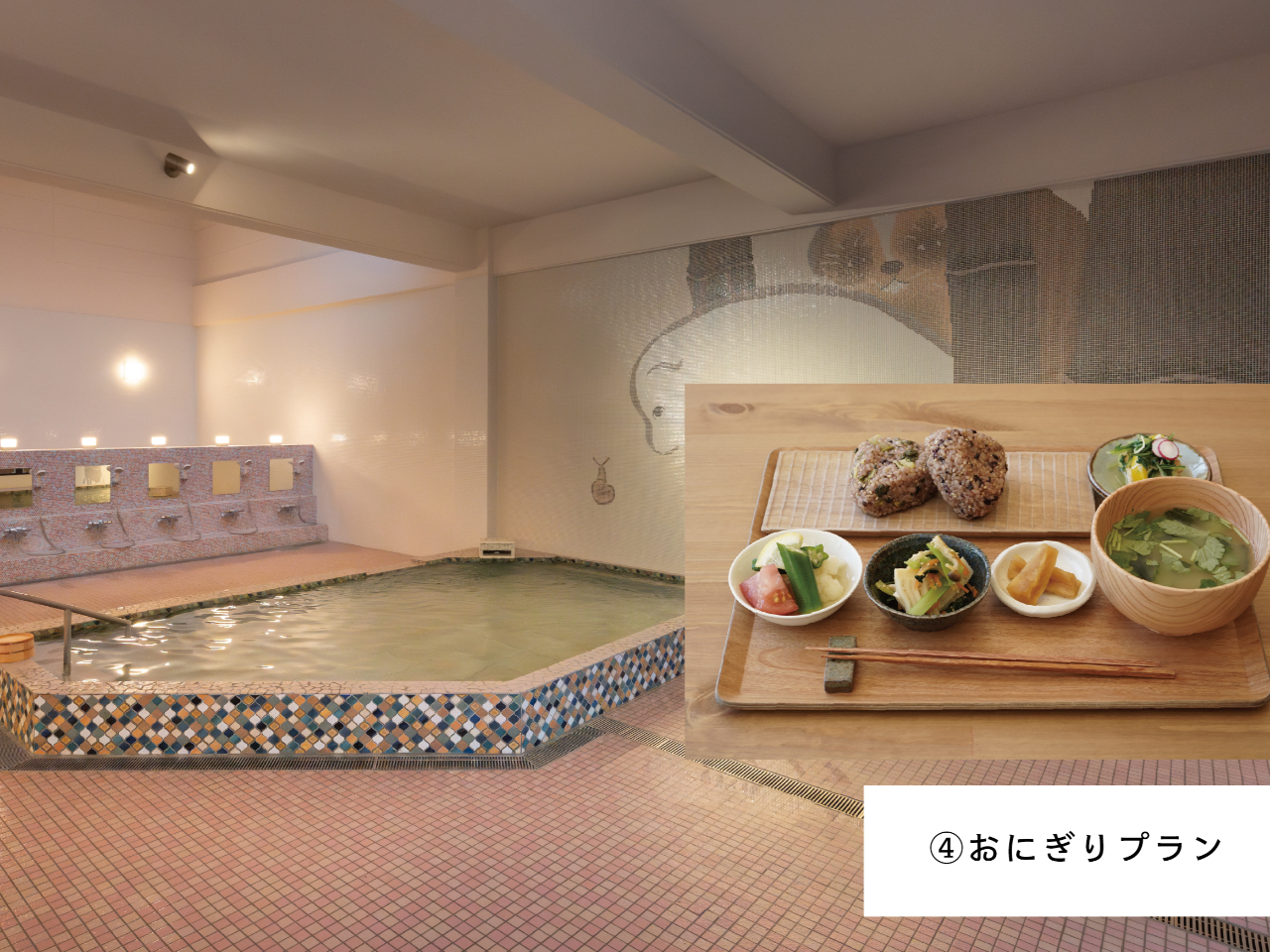 - 日帰り入浴+おにぎりランチプラン<入浴料金+おばんざいセット、お好きな玄米おにぎ...