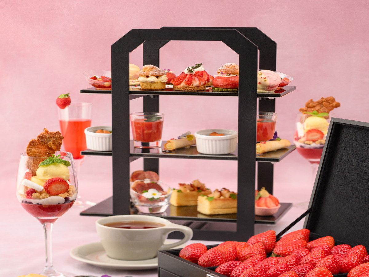 - いちごのマカロンなど春色のひとくちスイーツ。 *メニューが変更になる場合がございます。 *ドリンク付き(大阪エクセルホテル東急オリジナル『万華鏡コーヒー』、紅茶またはほうじ茶)