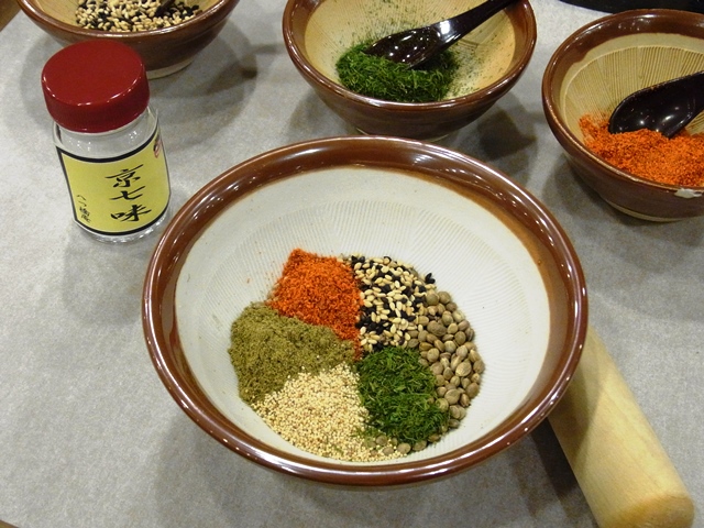 - オリジナルブレンドで京七味を作れます。とうがらし、山椒、青のり、陳皮、胡麻(白ごま、黒ごま)、ケシの実、麻の実を使用。好みの配合が出来たら出汁に入れて味見。辛さの加減や、風味を調整してビンに詰めます。