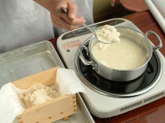 - 京都を代表する食材の一つ「おとうふ」。豆乳・おからづくり、そして「おぼろどうふ」から 「木綿どうふ」までを作ります。 「おとうふ」を作りながら、オリジナル七味も調合していただきます。
