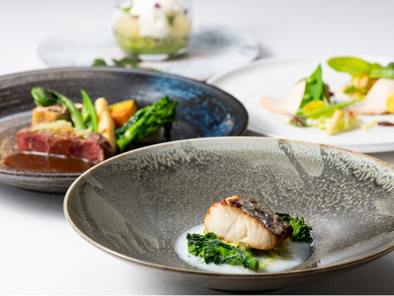 - 通常のプリフィックスランチに加えて前菜をもう1種お選びいただけるグレードアップコースです。 季節の前菜をぜひお楽しみください。