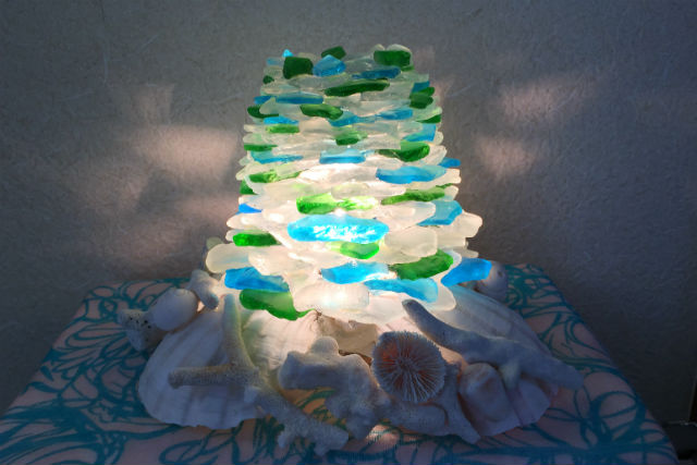 - ビーチに流れ着くシーグラスや貝殻、サンゴを使って世界で一つのランプシェードを作りましょう シーグラスや貝殻の隙間から柔らかくこぼれる光が癒しの空間を作ってくれますよ お部屋の主役になること間違いなし