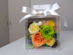 - プレゼントにもぴったり!透明の瓶のケースにアレンジ、メンテナンス不要。そのまま飾っていただけます オレンジ、グリーン、イエローのプリザーブドフラワーのバラをメインにカラフルなアレンジです