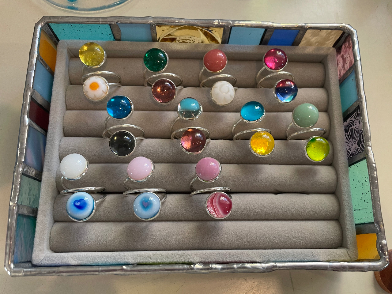 - 様々な色のガラスをカットし、お花やいろんな柄のミルフィオリなどを並べて窯で焼き上げ、オリジナルな小皿やパネル、アクセサリーなどが作れます。 美しい色の世界に癒されます。