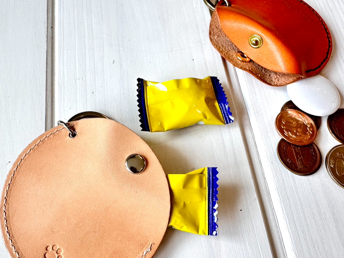 - カラフルな革から選べます。お好きなお色を組み合わせて5百円玉が合計4枚入るコインケースのキーホルダーを作ります。刻印を入れてもかわいいです。