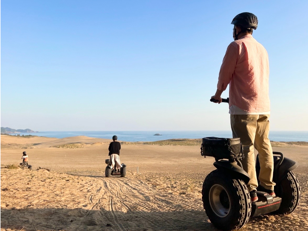 - 鳥取砂丘の広大な景観の中をオフロード用セグウェイに乗って、心地よい速度で気持ちよい風を感じつつ、雄大な景色を一望しながら周遊できる新体験です!運動が苦手でも体力に自信がなくても手軽に楽しめる!