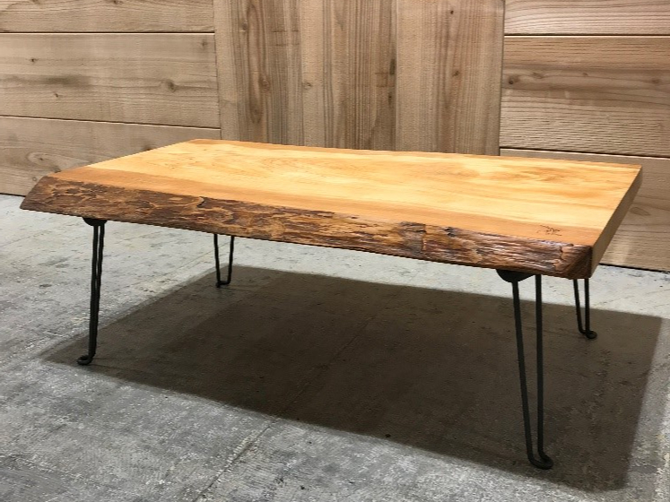 - 家具職人の仕上げ内容と同じ作業で仕上げるヒノキ一枚板を使用した折り畳みテーブルづくりです。 天板を削り、電動工具で脚を取り付け、焼印を押し、塗装をして仕上げをします。