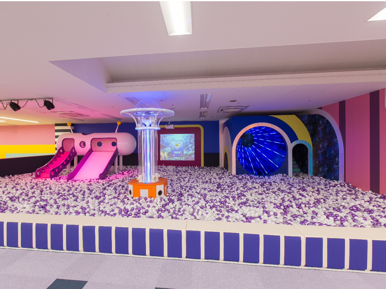 - 約10万個のウレタン製ボールを使用した国内最大級ボールプール、最新VR技術を駆使した360°3Dプロジェクターなどを備えた大型キッズパーク!