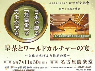 - 世界文化の輝き、被災者支援と希望への架け橋プロジェクト 「呈茶とワールドカルチャーしの宴」を令和7年11月30日(日)に名古屋能楽堂にて開催 8月29日に中日新聞にも掲載されました