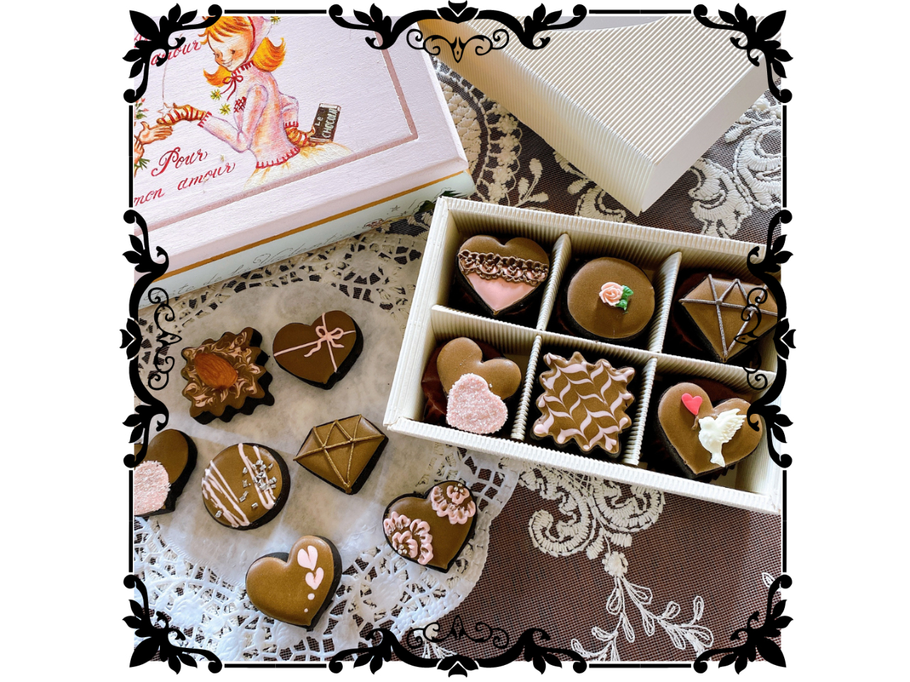 - アソートチョコレートをイメージした小さな可愛らしいクッキーです。こちらは初心者の方でも作りやすいデザインとなっております。プレゼント用の箱もお付けいたします。 今年のバレンタインの贈り物にぜひ。
