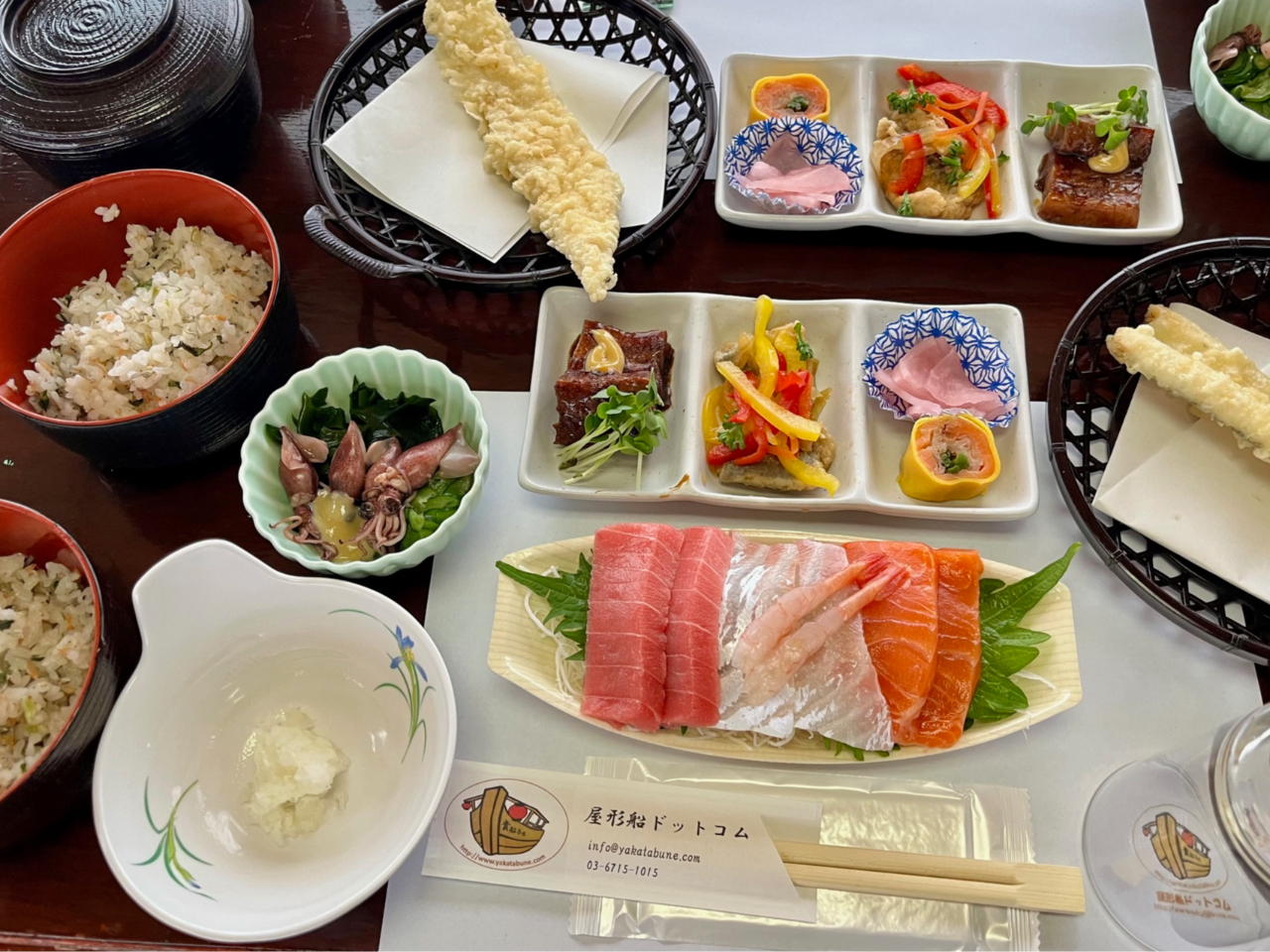 - ■Cコース 8,800円 (ワンドリンク付き) ■18:30出航 大人2名様から ■船内調理&その日とれた食材にこだわる料理自慢の屋形船