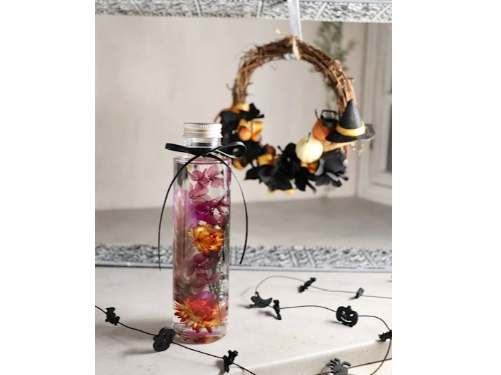 - ハロウィン気分を盛り上げる「ハーバリウム」&「ハロウィンリース」。オイルを注いだときのワクワク感。。花材も多数ご用意しています。「ハロウィンリース」は、飾りやすい15cmサイズです♪