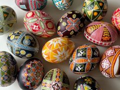 - ウクライナの伝統的なイースターエッグ「ピサンキ」を作る教室です。卵の殻に「キストカ」という特殊なペンを使って、蜜蝋で模様を描いていきます。何色も色を重ねてロウを剥がすと、美しい模様が浮かび上がります。