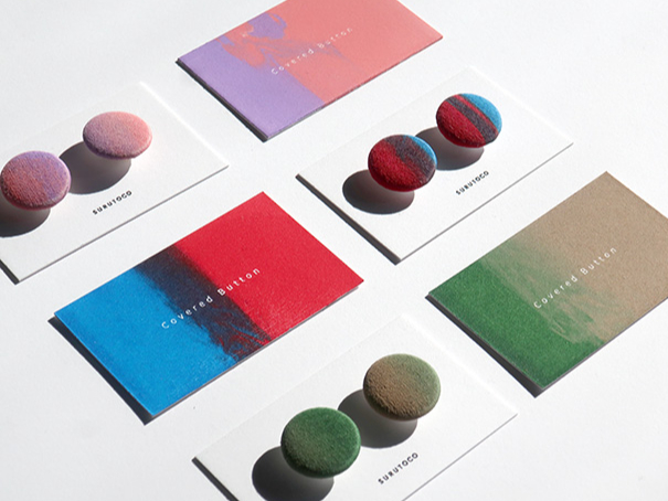- 好きなインクを2色選んで、シルクスクリーンで布と紙に印刷!布は〈くるみボタン〉に仕立ててパーツをつけてアクセサリーに、紙は箱の上に貼り付けてパッケージにします。箱に作ったアクセサリーを入れて完成!