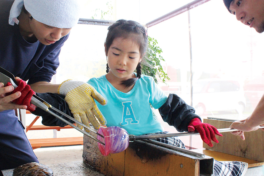 熟練の職人さんたちがしっかりとサポートしながらグラス作りを一緒に進めていくので初めての人も安心です。 10歳以上(小学生高学年)の方ならどなたでも体験できます。 ガラス製造...