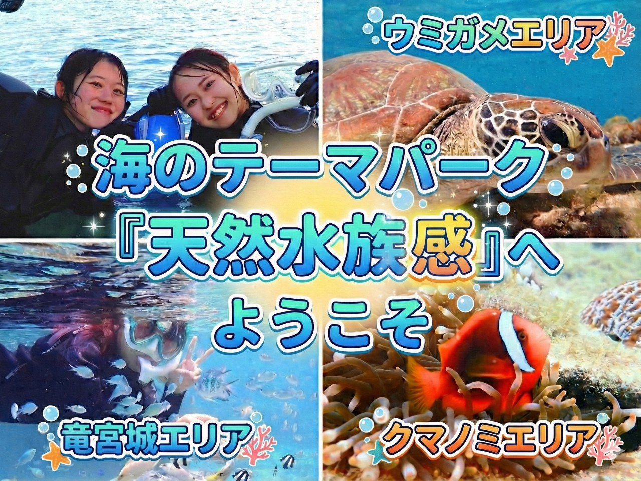 - みなさん、はいさい! 『海のテーマパーク』天然水族感へ、ようこそ! 「泳ぎが苦手…初めてで不安…」 そんな方にこそ 体験してほしい、特別な冒険がここにあります 100種以上の生物達が待つ世界へ、いざ!