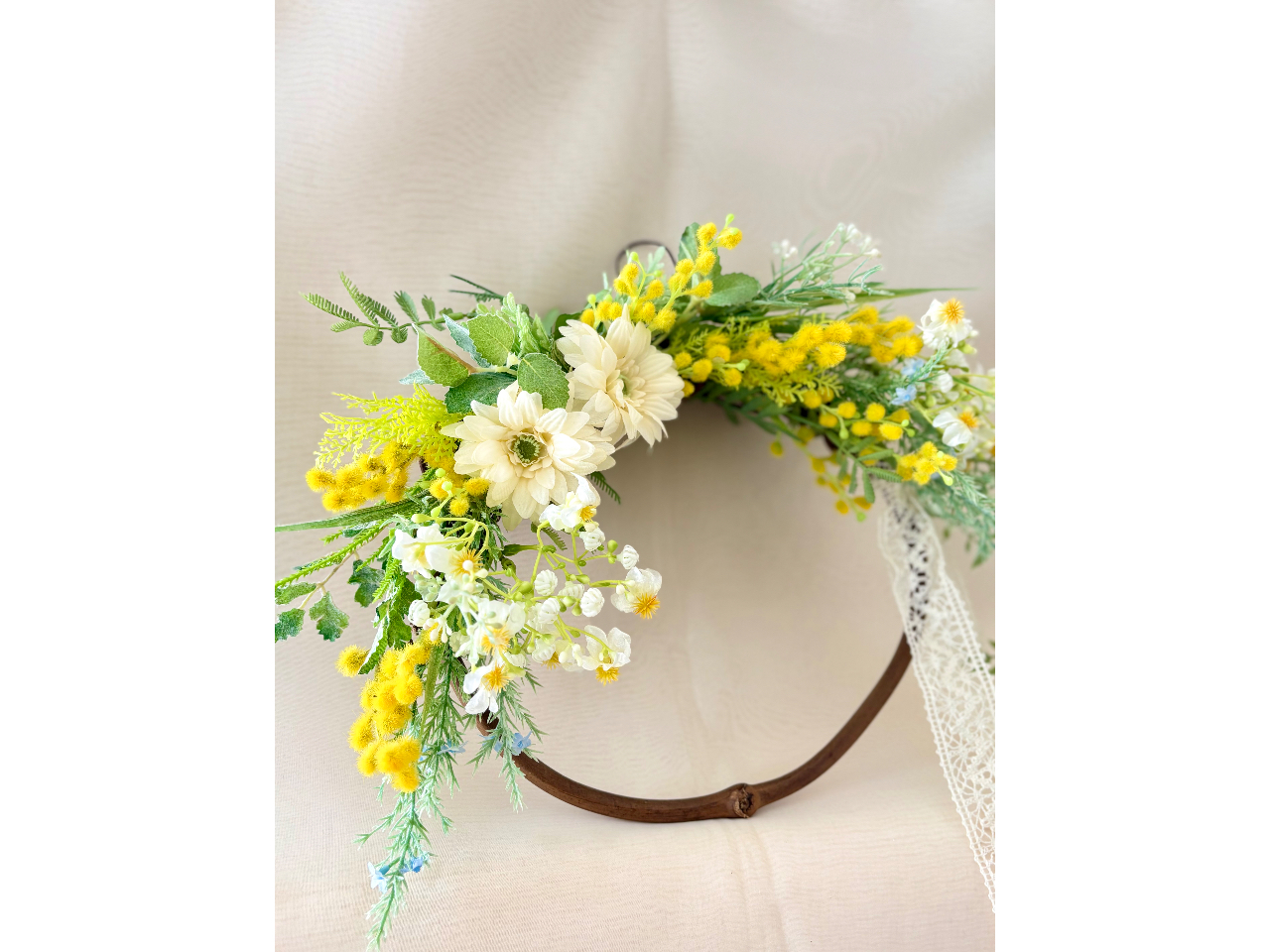 - アーティフィシャルフラワーのミモザをたっぷり使用したハーフリース♪ 花粉もなく、長く飾れて人気です! お気軽にご参加ください
