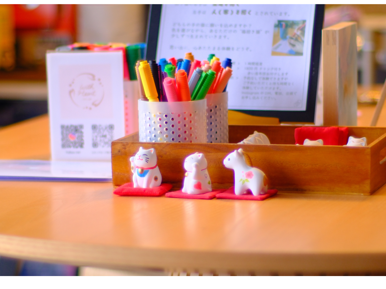 - 寒川さんぽの思い出に、福を招く招き猫作り。 カフェのワンドリンク付きなので、お茶を飲みながら絵付け体験をお楽しみいただけます。