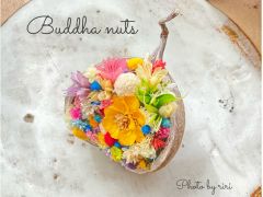 - 仏様の頭の形に似ていることから、 幸運のインテリアと呼ばれているブッダナッツ。 ブッダナッツにドライフラワーやプリザーブドフラワー木の実などでアレンジをするフラワーレッスンです。