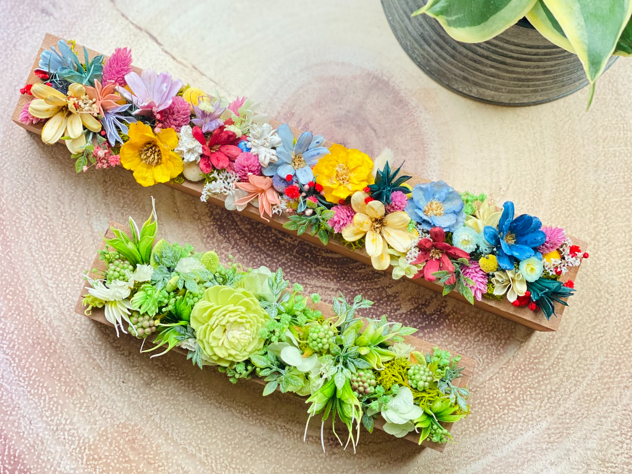 - バトンのように細長いシャビーシックな木箱にお好きなドライフラワーやプリザーブドフラワーをアレンジします。 壁に飾ったり玄関に置いたり、フォトフレームのように立てて飾ったり、3通りの飾り方ができます。