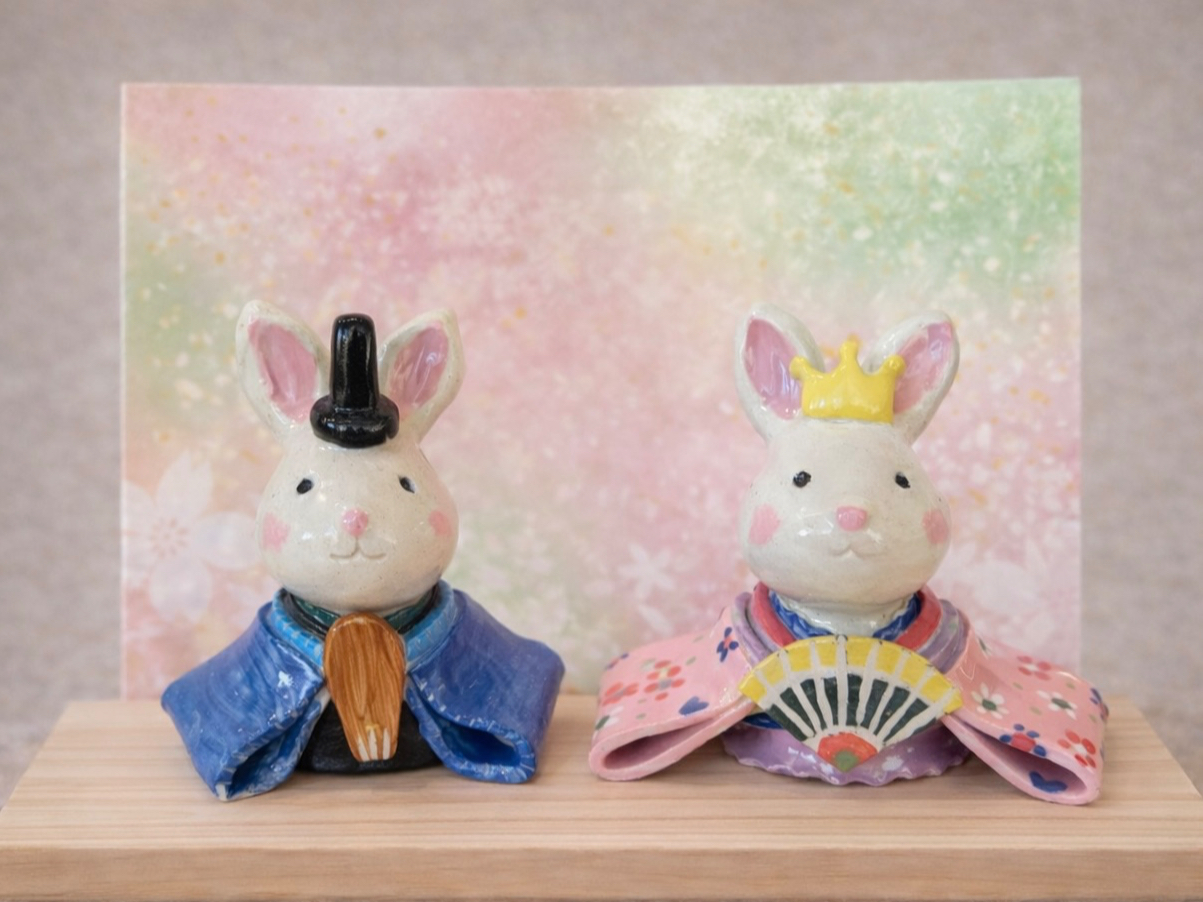 - ・うさぎの型があるので初心者でも可愛いうさぎ雛が完成 ・お一人様でお内裏様とおひな様の2体つくれます ・子ども・ファミリー・親子参加も安心の内容 ・男の子も被り物、持ち物をアレンジして自由自在の守り雛