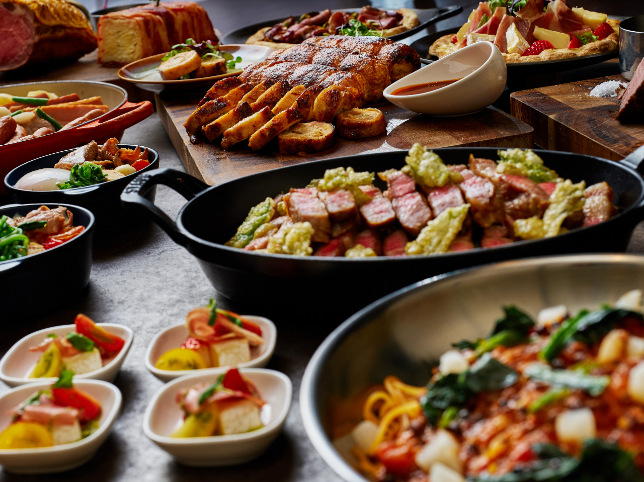 - 約30種類ものお料理が食べ放題★ ライブクッキングでは牛肉の鉄板焼きをご用意 セルフアメリカンワッフルやパンケーキもお楽しみください
