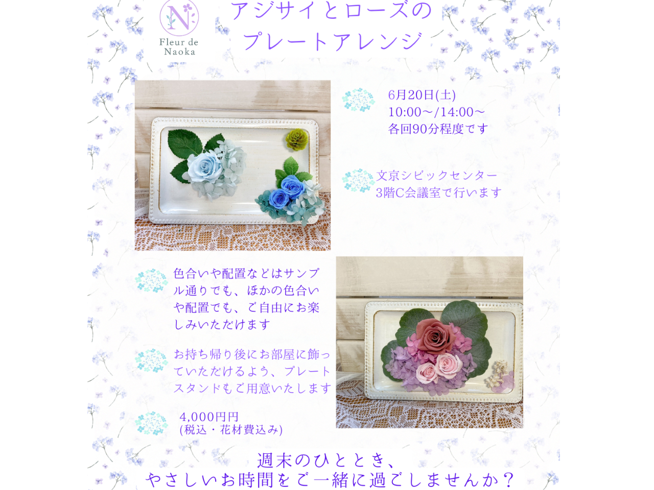 - \\オススメポイント!// ・白いプレート(20p)に、アジサイとローズで、描くようなアレンジをご体験いただけます。 ・お好きな色合いのお花で、あなただけの作品をお作りいただけます!
